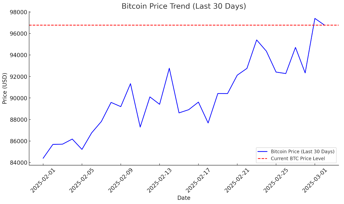 비트코인은 2024년 3월부터 점진적으로 상승세를 보이며 2025년 2월 10만 달러에 근접했지만, 최근 하락세를 경험했습니다. 아래의 최근 1개월 가격 추이 그래프에서도 변동성이 확대된 모습을 확인할 수 있습니다.
