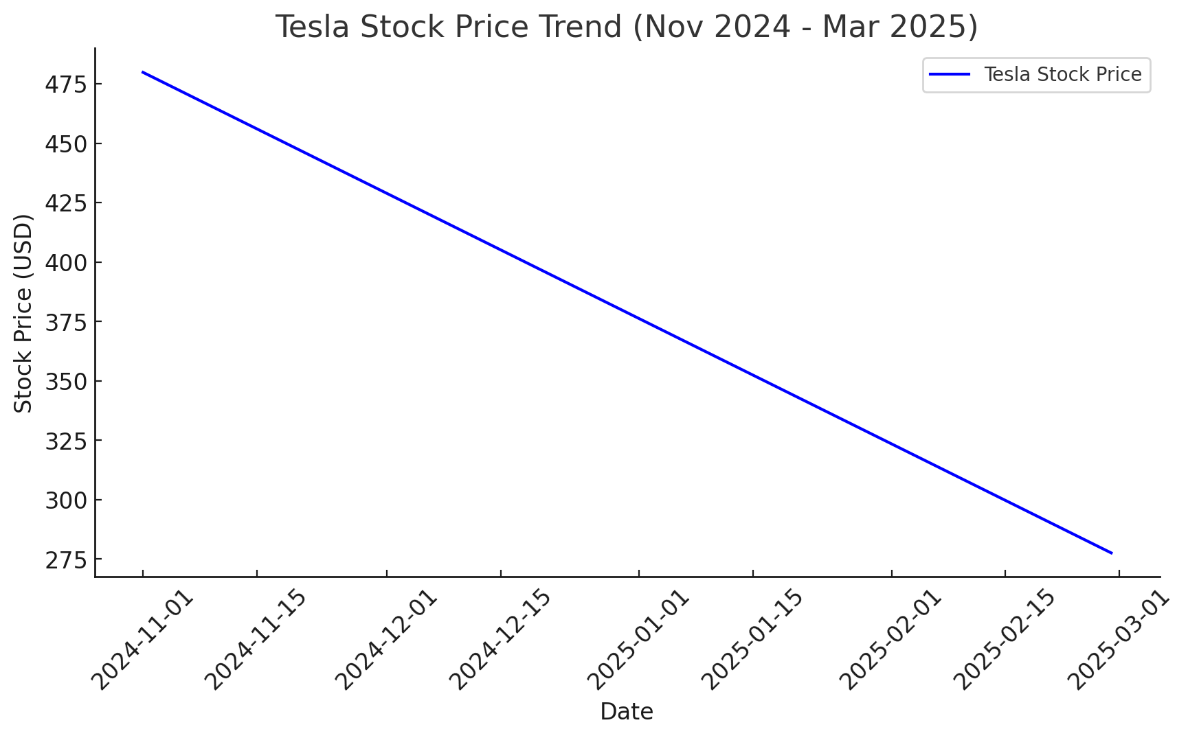 테슬라의 주가는 2024년 12월 17일 최고점(479.86달러)에서 현재(281.95달러)까지 약 41.2% 하락하며 변동성이 심화되고 있다. 특히 지난 1주일 동안 20.4% 하락, 레버리지 ETF(2X, 3X)도 70~80% 폭락하며 투자자들의 손실이 커지고 있다.