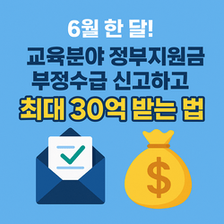 정부가 6월 한 달간 교육분야 정부지원금 부정수급 집중신고기간을 운영합니다. 이 글을 끝까지 읽으시면, 30억 원 보상금의 주인공이 될 수도 있어요.