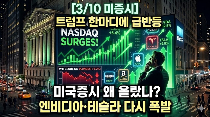 어젯밤 미국증시는 정말 극적인 흐름을 보여줬습니다. 장 초반만 해도 분위기는 무거웠습니다. 중동 리스크가 다시 시장을 흔들었고, 국제유가가 급등하면서 “이대로 가면 물가가 다시 튀는 것 아니냐”는 불안이 커졌기 때문입니다. 그런데 장 막판, 시장은 전혀 다른 표정을 만들었습니다. 오늘 아침 미국시황의 핵심은 단 하나입니다. 전쟁 우려 완화 → 국제유가 급락 → 기술주와 반도체 급반등이라는 흐름이 한 번에 이어졌다는 점입니다.